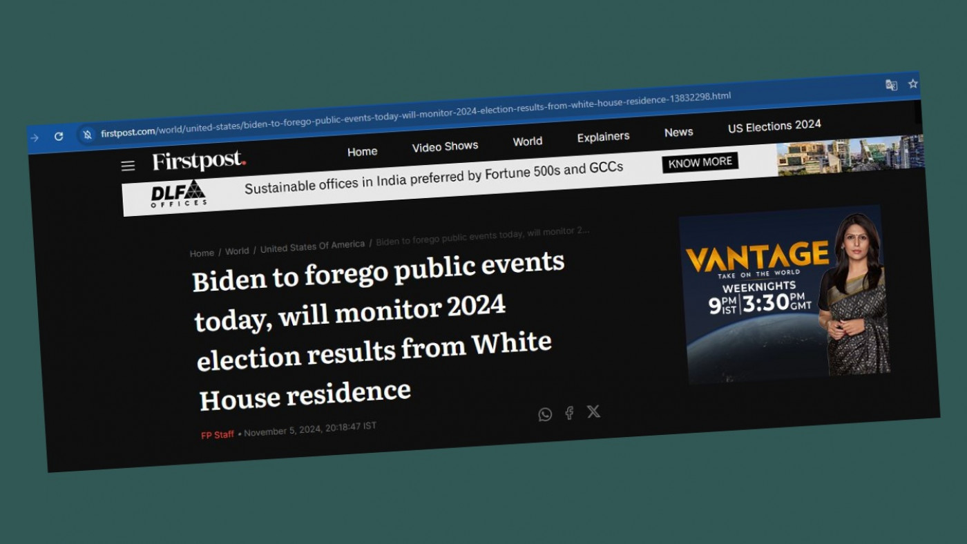 ফক্স নিউজ বলছে, হোয়াইট হাউসের এক কর্মকর্তার বরাত দিয়ে সিএনএন জানিয়েছে, প্রেসিডেন্ট জো বাইডেন হোয়াইট হাউসের বাসভবন থেকে ফার্স্ট লেডি জিল বাইডেন তাদের সহযোগী ও হোয়াইট হাউসের সিনিয়র কর্মীদের সঙ্গে নির্বাচনের ফলাফল দেখবেন।